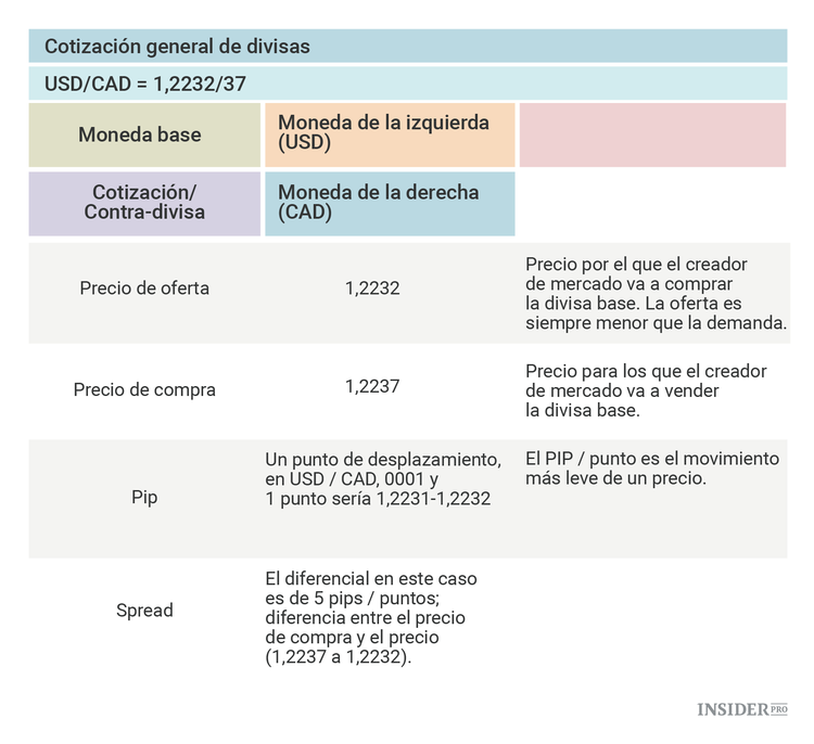 Sin embargo, con el fin de vender este par de divisas, o vender la divisa base a cambio de la moneda de la cotización, tendría que ver el precio de la oferta. Esto indica que el mercado va a comprar la moneda base de 1 US$ (que se vende en el mercado de la divisa base) por un precio equivalente a 1,2000 dólares canadienses, que es la moneda cotizada.