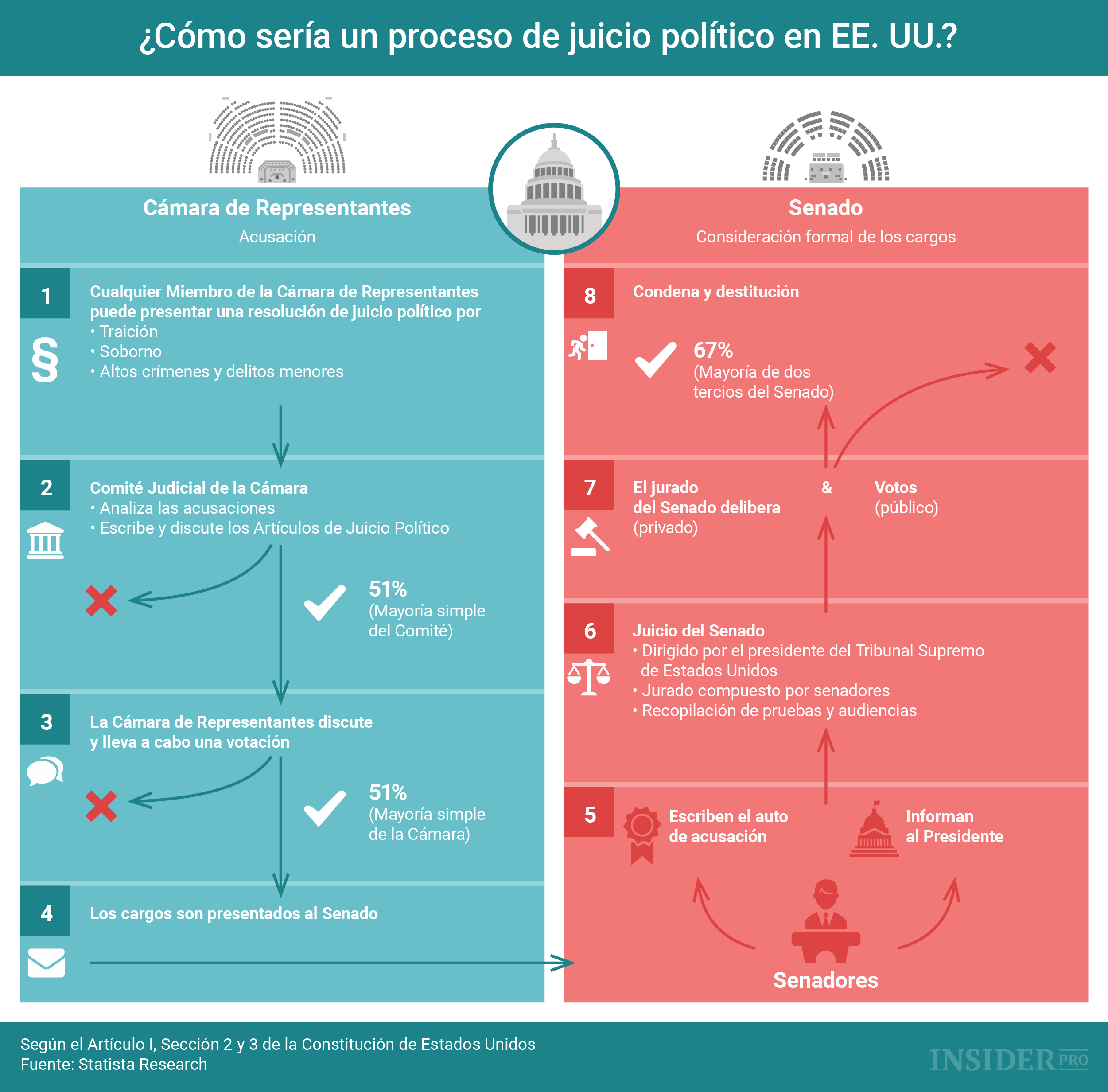 Tal y como muestra el gráfico, la destitución es un procedimiento muy complicado. Su iniciación no significa necesariamente que el presidente acabe abandonando el cargo. En toda la historia de EE. UU., tan solo ha habido dos casos en los que la cuestión del juicio político ha llegado al Senado - en 1868, cuando Andrew Johnson fue acusado de destituir de forma ilegal al ministro de la Guerra, y en 1998-1999, cuando Bill Clinton fue acusado de perjurio y obstrucción a la justicia en relación con la historia de Monica Lewinsky. En ambos casos, la acusación no obtuvo la mayoría necesaria de dos tercios.