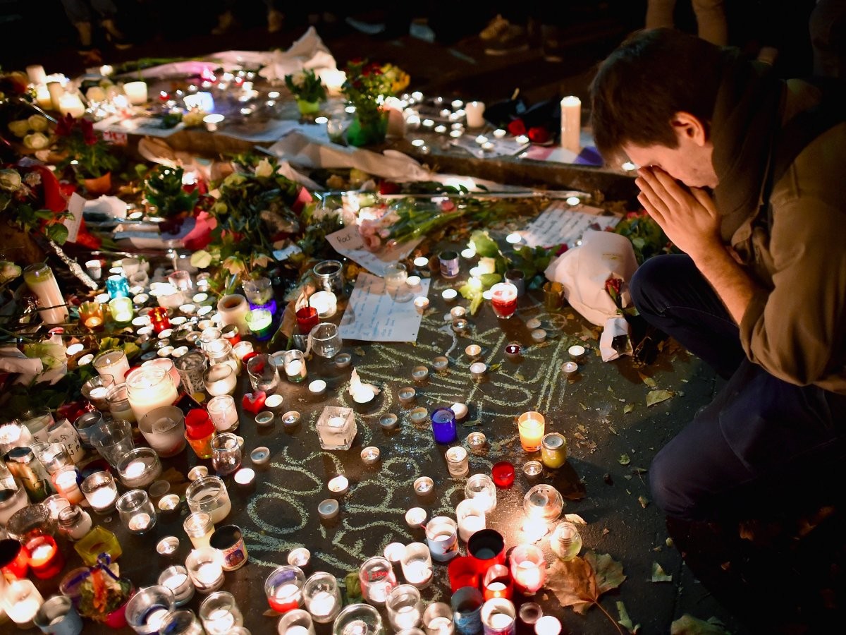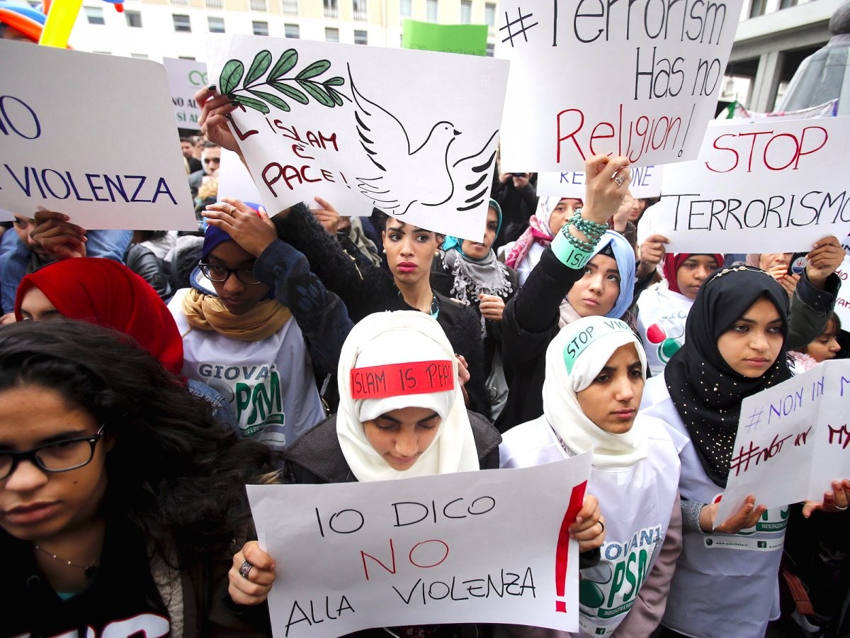 1/5 Protesta denominada «No en mi nombre», llevada a cabo por parte de los musulmanes italianos contra el terrorismo en el centro de Milán el 21 de noviembre. En la parte inferior del cartel se lee: «Yo digo no a la violencia»