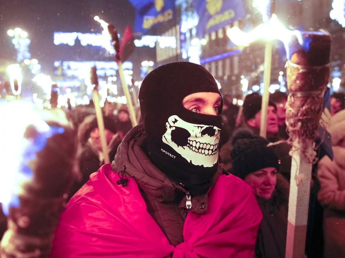 1/5 Activistas del partido nacionalista de Ucrania Svoboda (Libertad) en una manifestación con motivo del 107 aniversario del nacimiento de Stepan Bandera, uno de los fundadores de la Organización de Nacionalistas Ucranianos