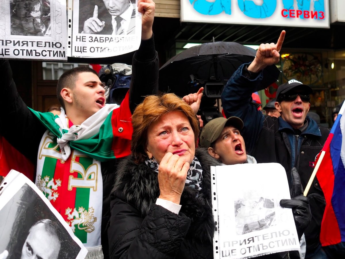 1/5 Partidarios del partido nacionalista de Bulgaria Attack con imágenes del presidente ruso, Vladimir Putin, durante una manifestación de apoyo a Rusia frente de la embajada turca en Sofía el 26 de noviembre
