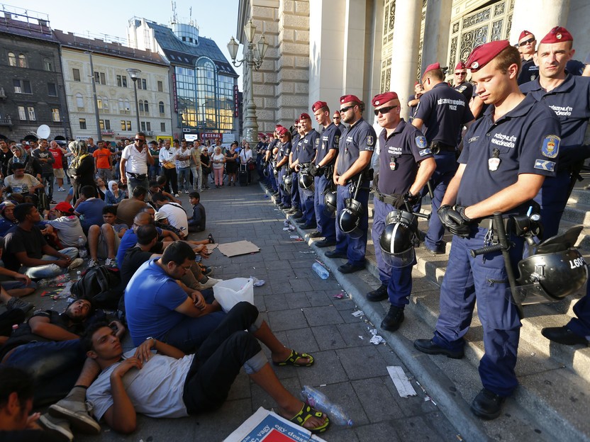1/5 Inmigrantes sentados como parte de una manifestación pacífica hasta que la policía bloquea la entrada de la estación principal de trenes del Este de Budapest