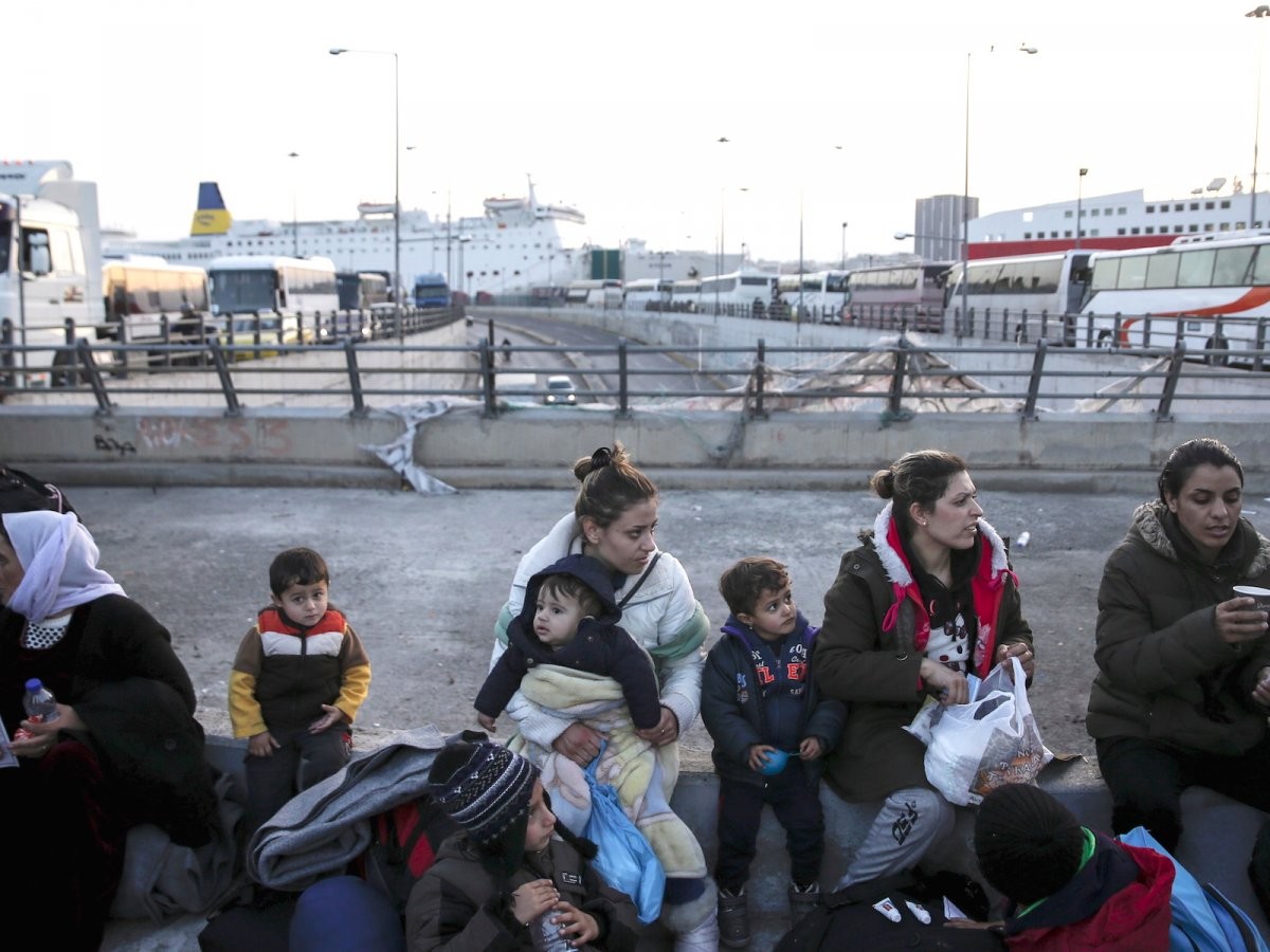 1/5 Refugiados e inmigrantes esperan para coger un autobús en la frontera entre Grecia y Macedonia el 19 de febrero