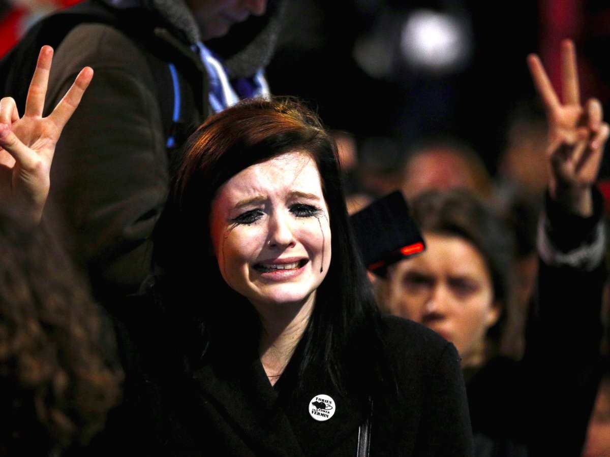 1/5 Un manifestante en Londres llora el 2 de diciembre después de que el Parlamento británico votara a favor de los ataques aéreos contra militantes en Siria
